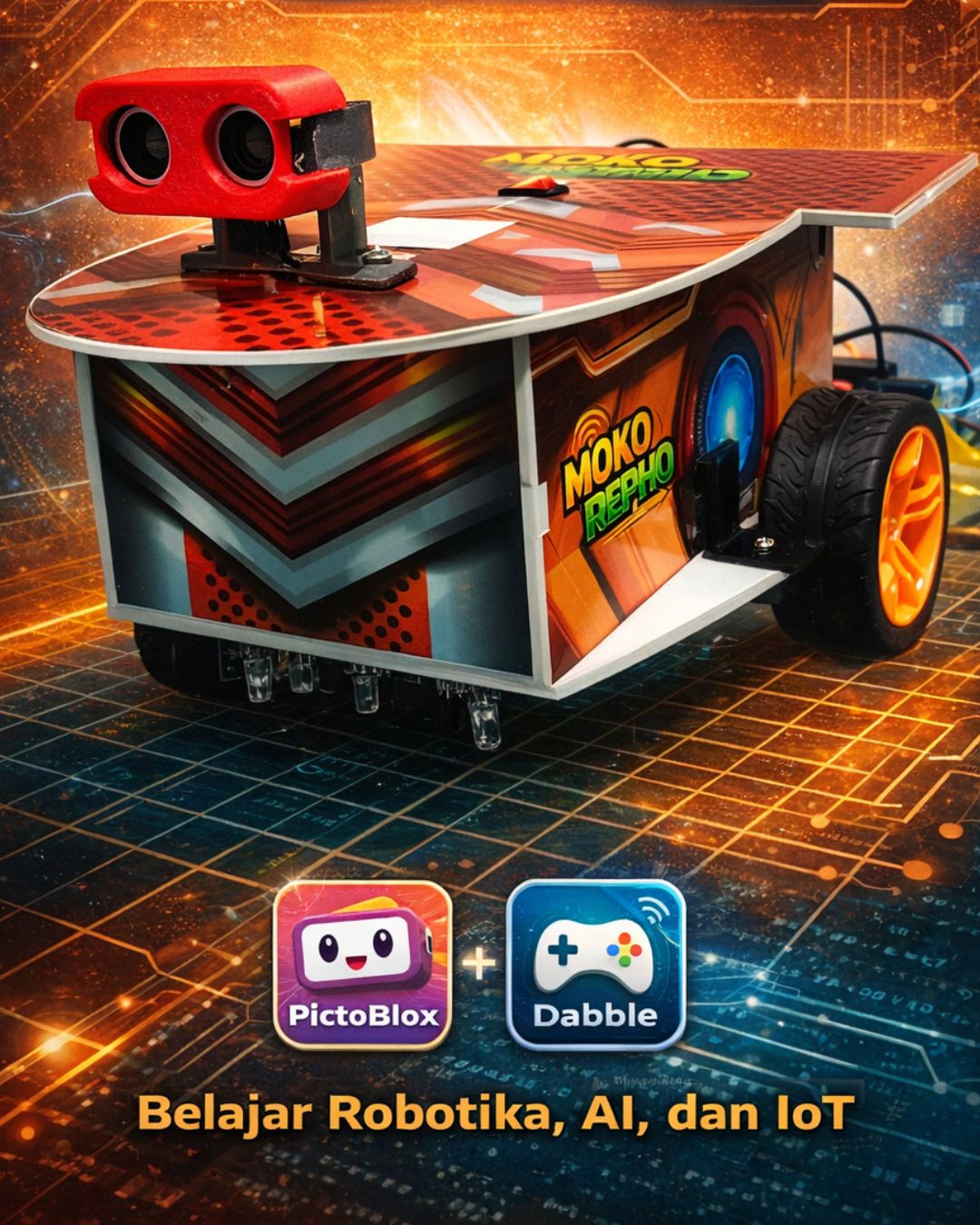 MOKO REPHO adalah robot edukasi berbasis ESP32 yang dirancang untuk membantu siswa memahami coding, sensor, dan robotika secara praktis menggunakan PictoBlox & Dabble.